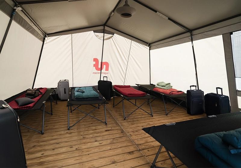 Hier schlaft ihr auf Campingliegen in einem Steilwandzelt mit festem Holzboden, Licht und Strom für max. 6 Personen. Aufpreis: inklusive